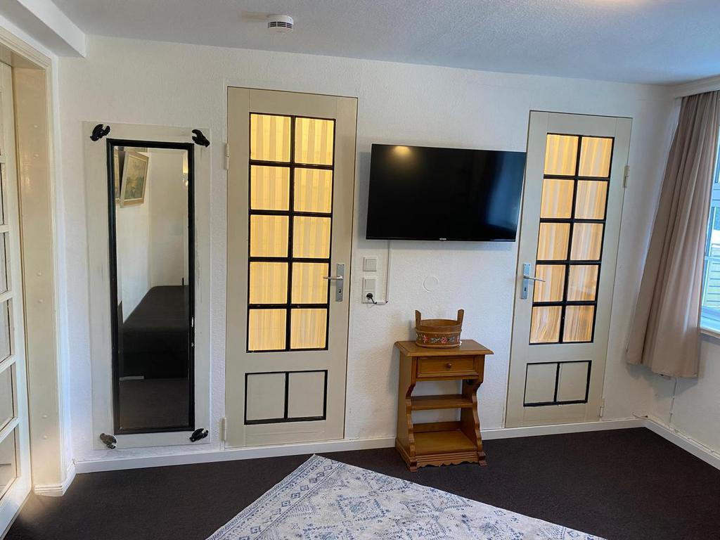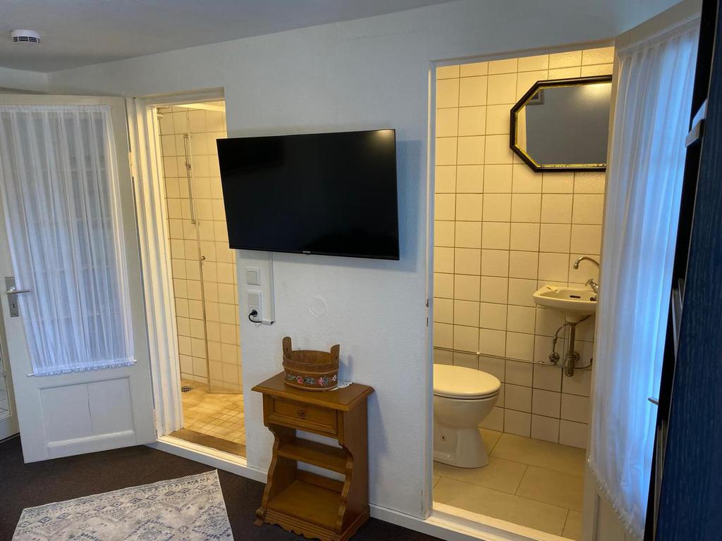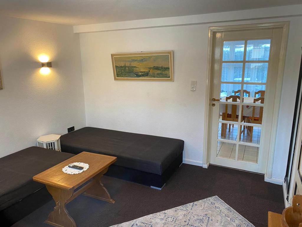 leicht zusammen schieben, wenn Sie das möchten. Ein Fernseher, ( SAT )ein kleines Radio, ein Tisch, ein Bänkchen, ein Wippsessel vervollständigen die Einrichtung. Vom Wohnzimmer ab gehen ein k l e i